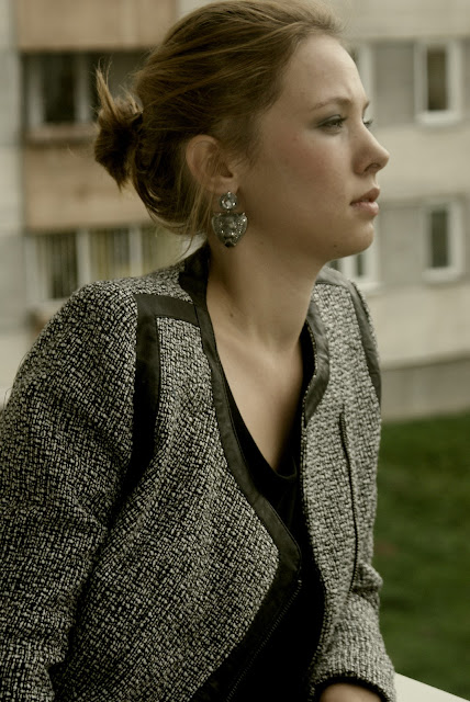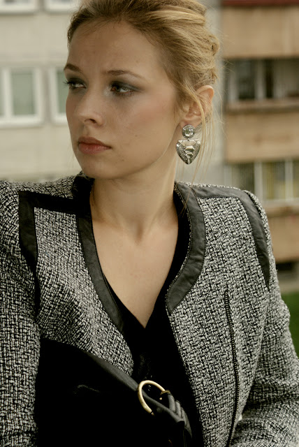 Oj nie lubię pisać! Jest to specjalność Emilki :) Dziś krótko! Jak widzicie dziś króluje szarość! Szara plisowana spódnica, szpilki ćwiekowane oraz szara jodełkowa marynarka. Dobrany do tego zwykły czarny T-shirt oraz dodatki.