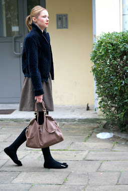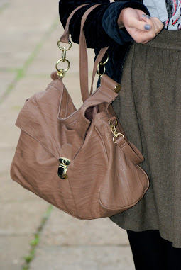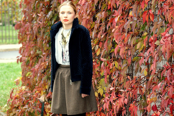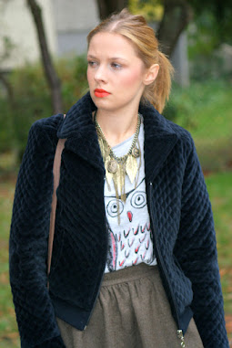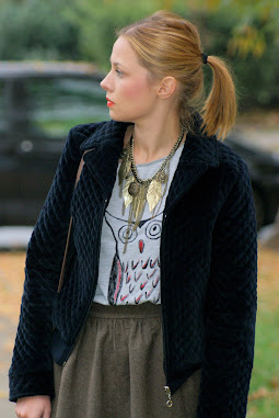 Już jakiś czas temu spodobał Nam się motyw zwierząt pojawiający się na swetrach i bluzkach. Nasza kreatywność nie zna granic, więc postanowiłyśmy same wymalować sobie zwierzątko! Postawiłyśmy na modną sowę, która znalazła się na zwykłej szarej koszulce. Do tego militarna rozkloszowana spódnica w nieokreślonym kolorze- trochę khaki, trochę szarym oraz welurowa pikowana kurteczka. Welur pojawił się jeszcze na balerinkach- buty na płaskim obcasie to podstawa, gdy do załatwienia jest całe mnóstwo spraw. Jeśli chodzi o akcesoria to padło na masywny naszyjnik w kolorze starego złota oraz pudrową torebkę.