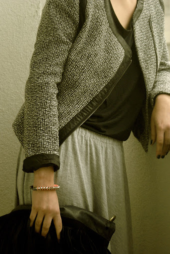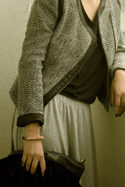 Oj nie lubię pisać! Jest to specjalność Emilki :) Dziś krótko! Jak widzicie dziś króluje szarość! Szara plisowana spódnica, szpilki ćwiekowane oraz szara jodełkowa marynarka. Dobrany do tego zwykły czarny T-shirt oraz dodatki.