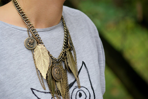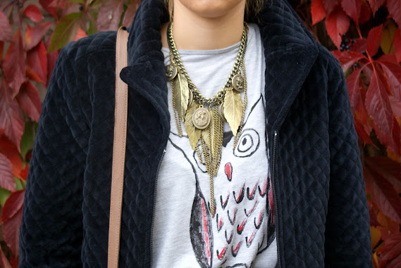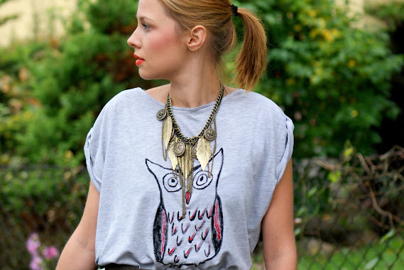 Już jakiś czas temu spodobał Nam się motyw zwierząt pojawiający się na swetrach i bluzkach. Nasza kreatywność nie zna granic, więc postanowiłyśmy same wymalować sobie zwierzątko! Postawiłyśmy na modną sowę, która znalazła się na zwykłej szarej koszulce. Do tego militarna rozkloszowana spódnica w nieokreślonym kolorze- trochę khaki, trochę szarym oraz welurowa pikowana kurteczka. Welur pojawił się jeszcze na balerinkach- buty na płaskim obcasie to podstawa, gdy do załatwienia jest całe mnóstwo spraw. Jeśli chodzi o akcesoria to padło na masywny naszyjnik w kolorze starego złota oraz pudrową torebkę.