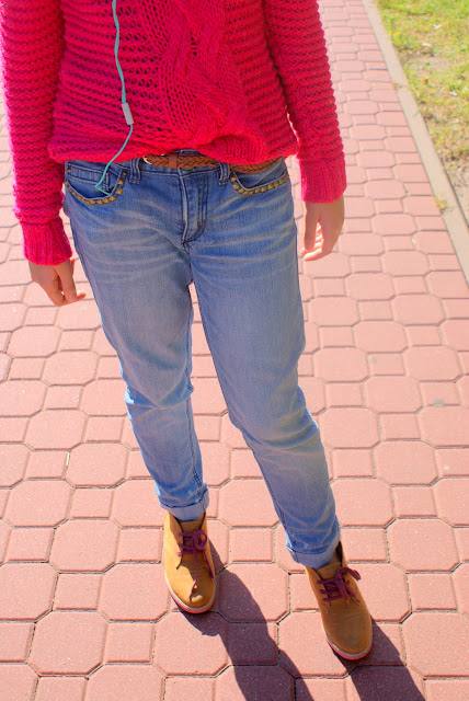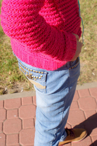 gustu (na pewno zobaczycie je w następnych stylizacjach!). Do tego mocno różowy sweter z dziurami. Dla przełamania zwężone w nogawkach