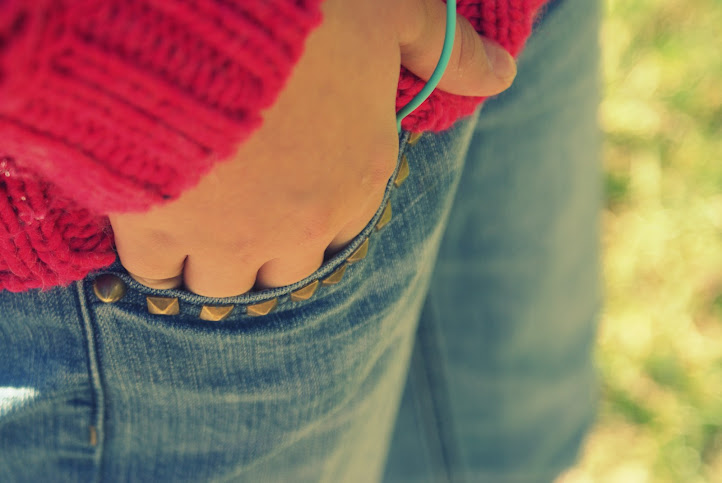 jeansy (tzw. marchewy) ze złotymi ćwiekami- tak dobrze nam znanymi. Ale mi ćwieki na pewno się nie znudzą! Stylizacja lekko hip- hopowa, luźna, ale zarazem nieprzesadzona i zupełnie naturalna! Prostota przełamana intensywnym kolorem jest najlepszym wyjściem!
